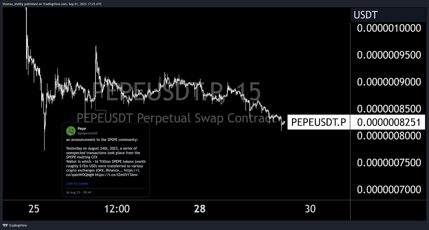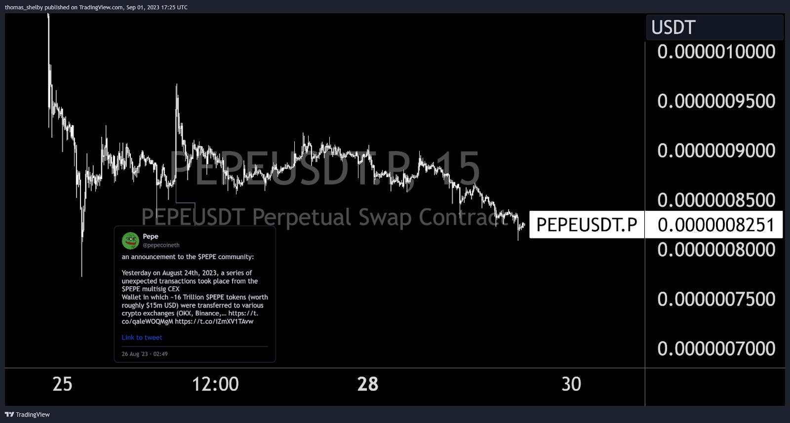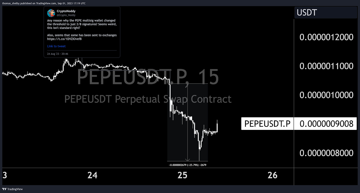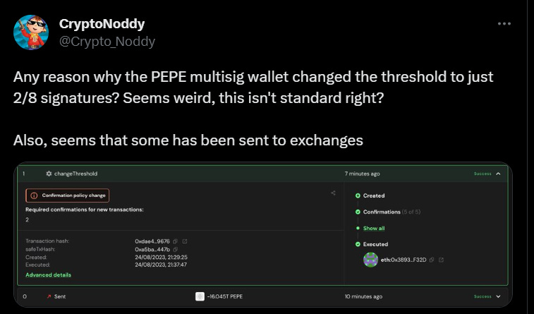On August 25th, the PEPE multisig sent $15.7 million worth of tokens to various exchanges. Shortly after, the PEPE multisig changed the number of required signatures from 5/8 to 2/8.