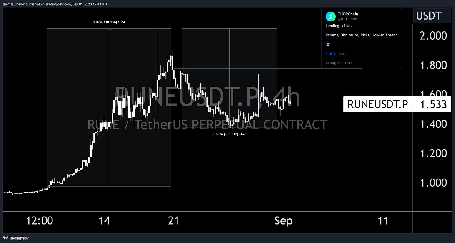 Thorchain had a mini bull run within the bear market in August, pumping roughly 110%. They then came out with an announcement releasing their highly-anticipated new lending protocol and the news sold off, marking a local top.