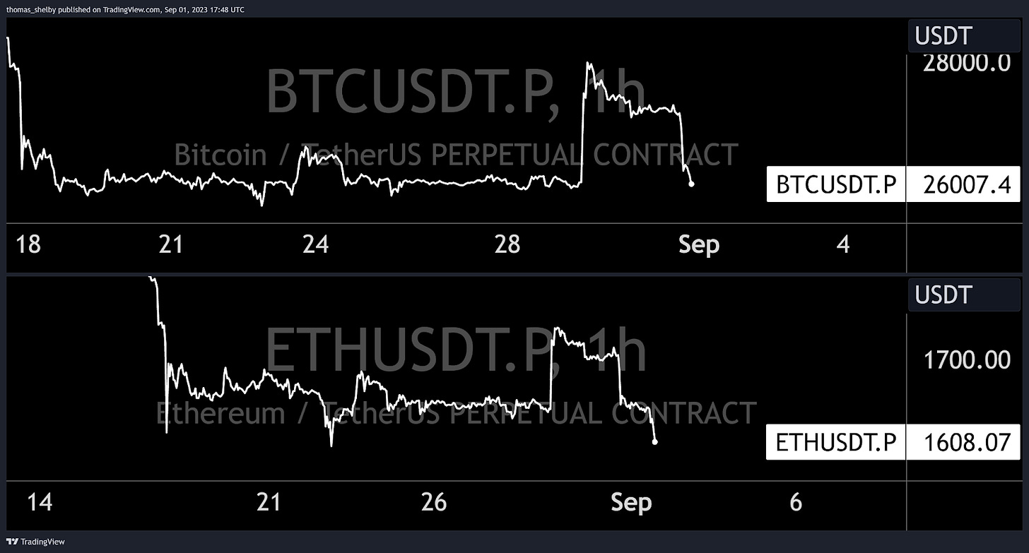 This week was particularly eventful due to updates from Grayscale and the ETF sector. While Monday passed without significant events, the Grayscale announcement sent BTC soaring to 28k within a matter of minutes. Subsequently, anticipation of the ETF delay news led to a gradual decline, with BTC dropping from $27,200 to $26,000 in just 7 hours. As of the end of the month, we find ourselves right back at the week's starting point, echoing a similar pattern from the previous week.