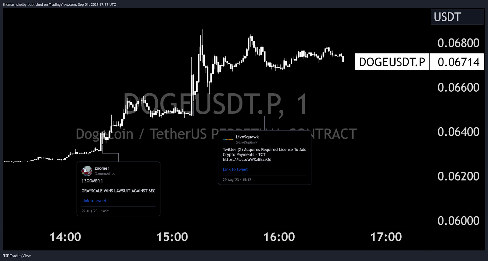 Just minutes after the Grayscale announcement was released, which changed the momentum for the entire market, Twitter aka X took advantage of the bullish sentiment and publicized that their application to integrate crypto payments was approved. This led to a further push in the price on DOGE, Elon’s favorite crypto and Twitter proxy, leading to total gains of almost 7% in 2 hours. After the announcement, the X community started speculating on the type of crypto services X will be offering, however nothing was further revealed.
