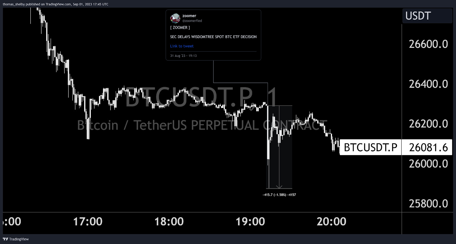 After the first decision to delay (Wisdomtree) came out, it became apparent that every application decision was likely to follow. However, traders still held their breath until the most important of all was officially released, Blackrock’s iShares Bitcoin Trust. An hour after the first decision, the SEC finally announced that Blackrock was also delayed, confirming 6/6 delays and pushing the decisions to mid October.