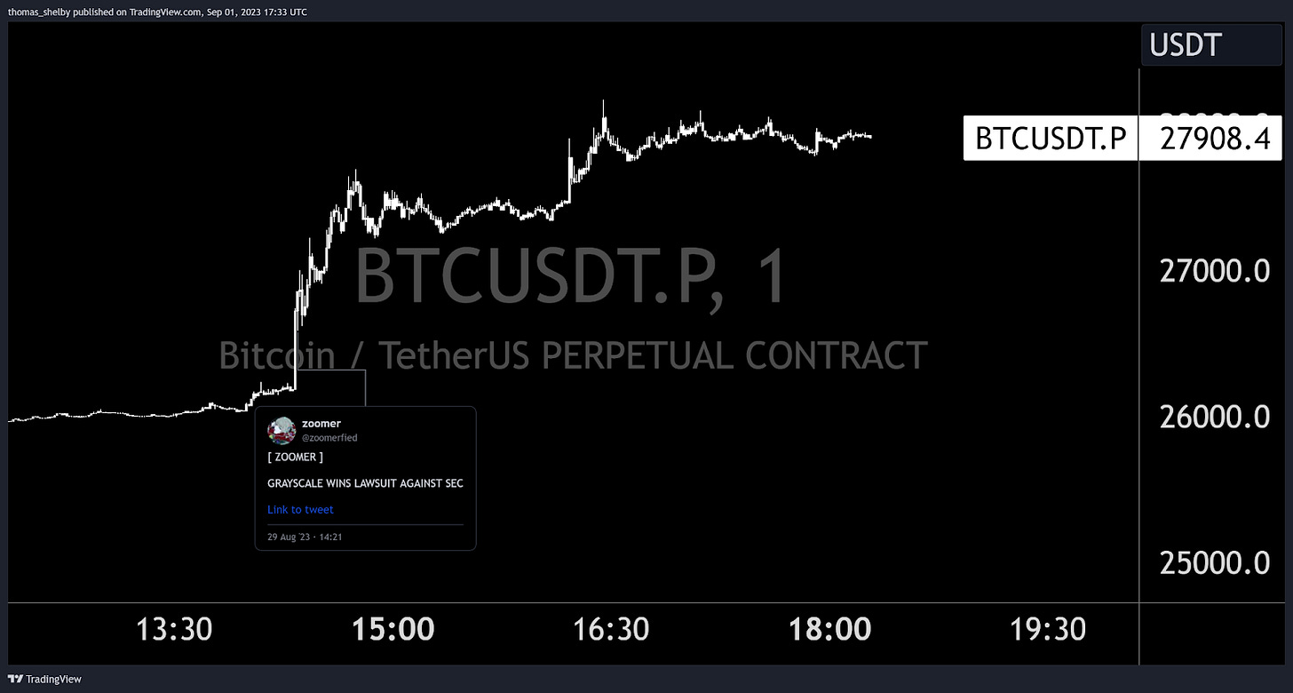 Now that the summer is over, traders slowly return and search for things to do. The recent up-move on BTC to 28k, and the rest of the crypto capital markets occurred following the headline that Grayscale won its case against the SEC. The judge highlighted their inconsistent actions and forced the SEC to look at Grayscale's application. They (the SEC) have to examine it, but this doesn’t mean they will approve it.