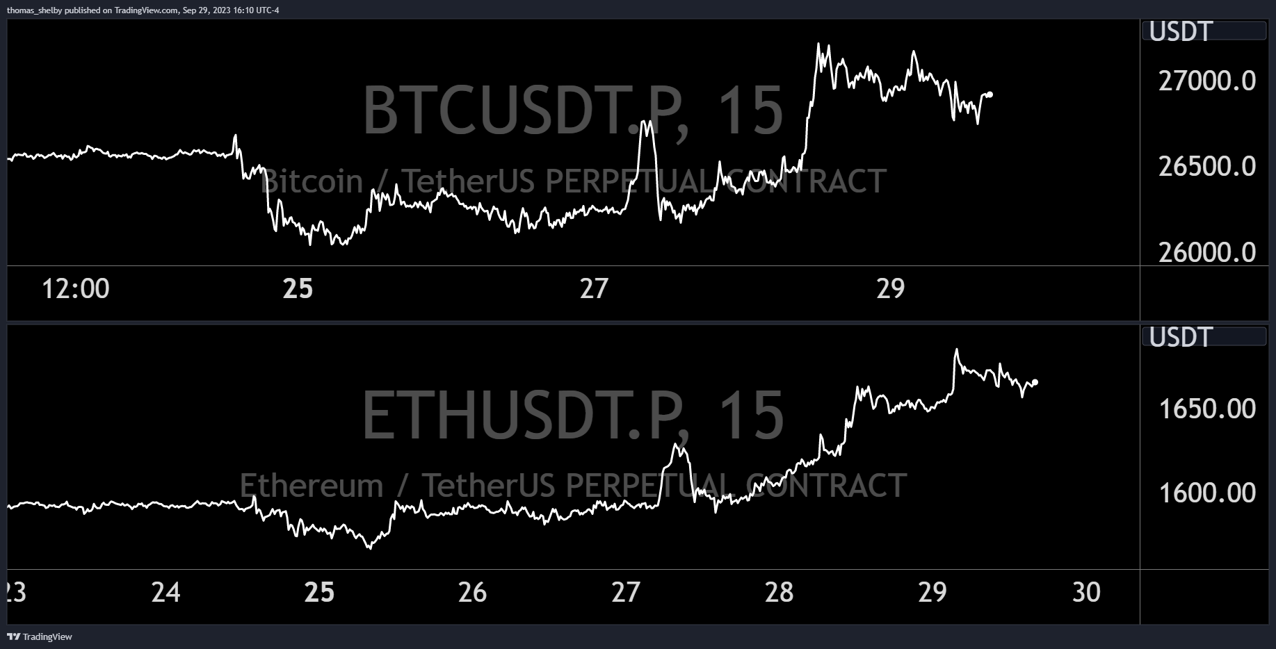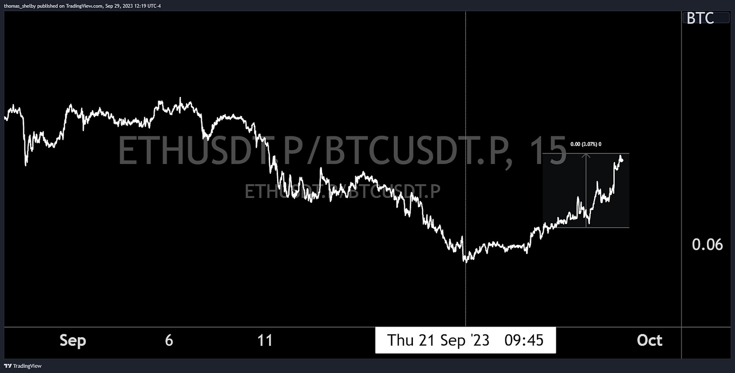 ETH behaved much better than BTC this week, being up a modest ~3% on the ETH/BTC pair. Since the Wednesday vicious retracement move, ETH is up close to 6% showing strong relative strength, possibly due to a combination of two factors: the ETH futures ETF narrative and the absence of Saylor's buying pressure on BTC.