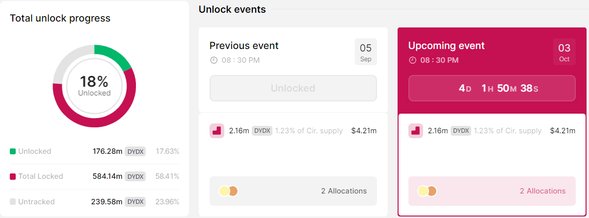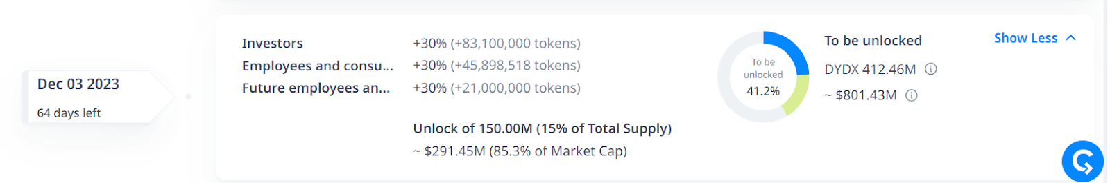 DYDX unlocks 1.23% of the circulating supply (~$4.21M) on Tuesday. While this supply unlock may not be significant, DYDX faces a much larger unlock of 15% of the total supply in December, which was previously delayed from February. It will be interesting to observe how DYDX performs in the lead-up to this December unlock, as it could present shorting opportunities if the market flips bullish.
