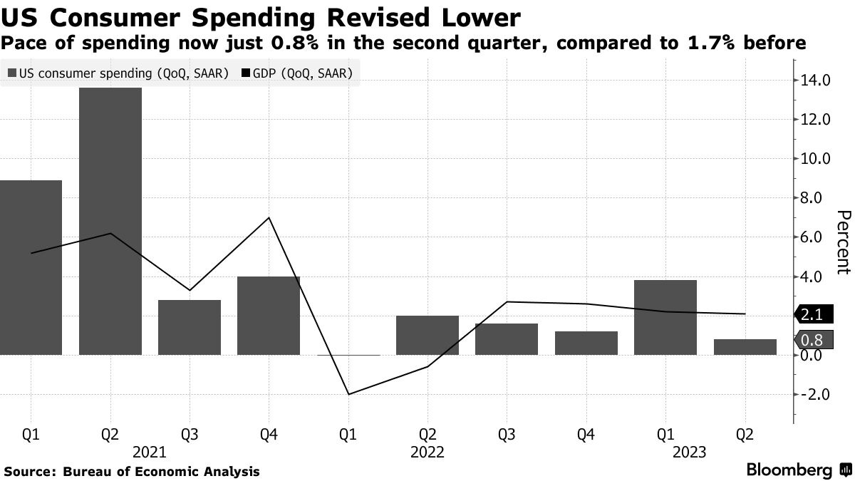 This week's data was favorable for the Fed but less favorable for the economy. Confidence among consumers fell to a four-month low on Tuesday, followed by a significant downward revision in consumer spending on Thursday, with consumer spending rising at the weakest pace in a year last quarter.