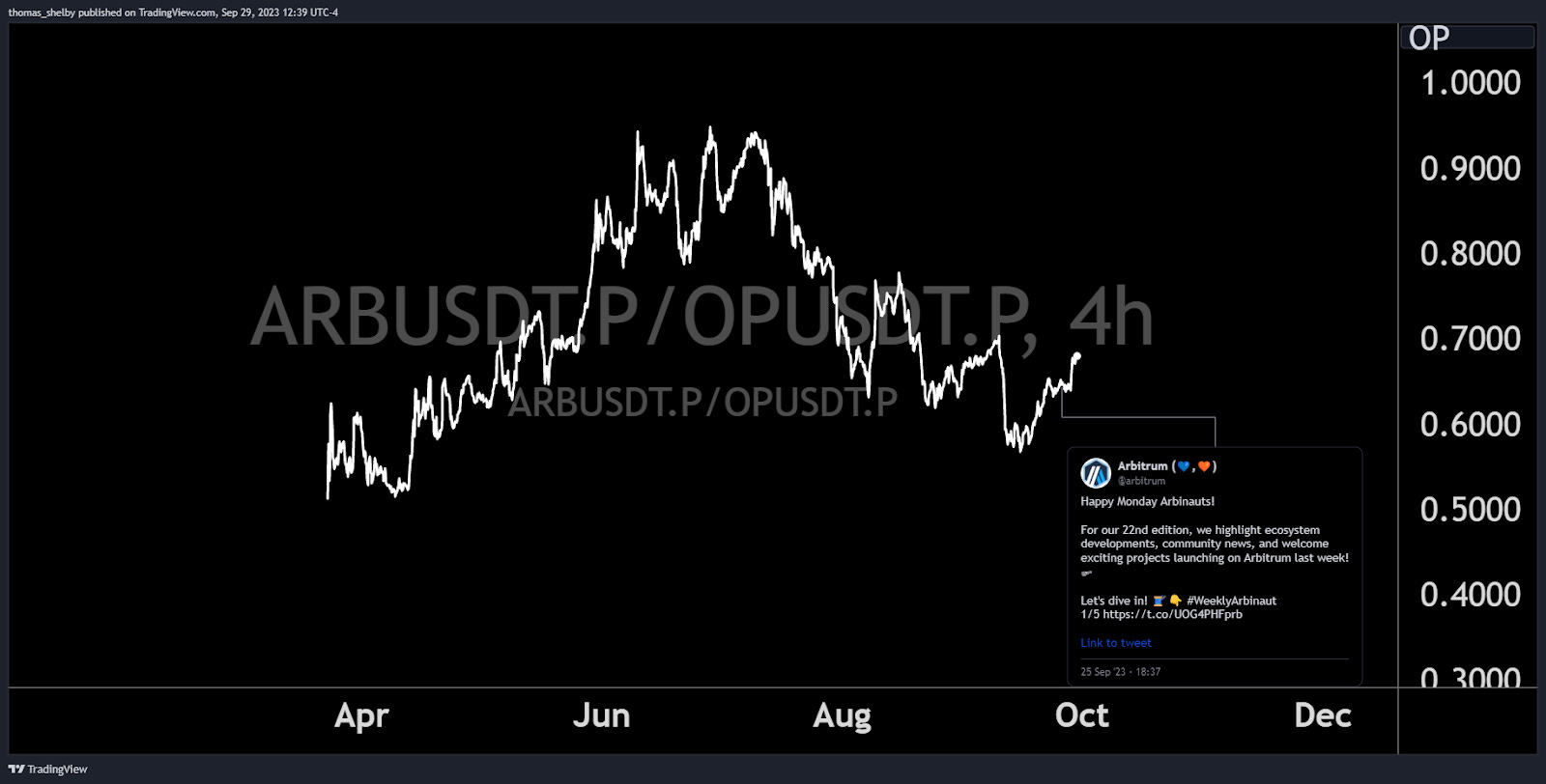 OP has a 3.03% ($32.13M) supply unlock scheduled for Saturday, making ARB/OP an interesting pair to keep an eye on. With ARB trending up again due to a proposal for ecosystem project grants, the pair could experience further upside potential.
