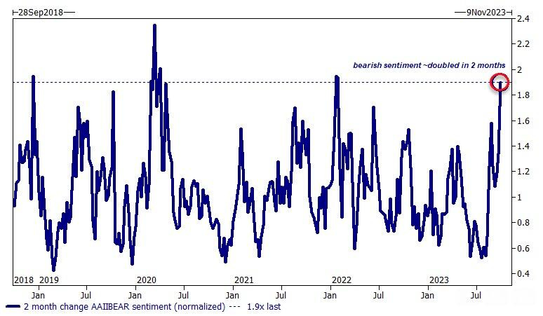 Following the drop in treasuries on Thursday, the S&P 500 rebounded by 0.7% from its lows, opening higher on Friday after the release of the PCE data, while the odds of a November rate hike eased. Bearish sentiment remains at levels last seen in March 2020 when stocks experienced a 30% crash, according to Goldman.