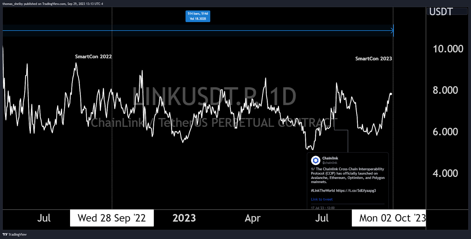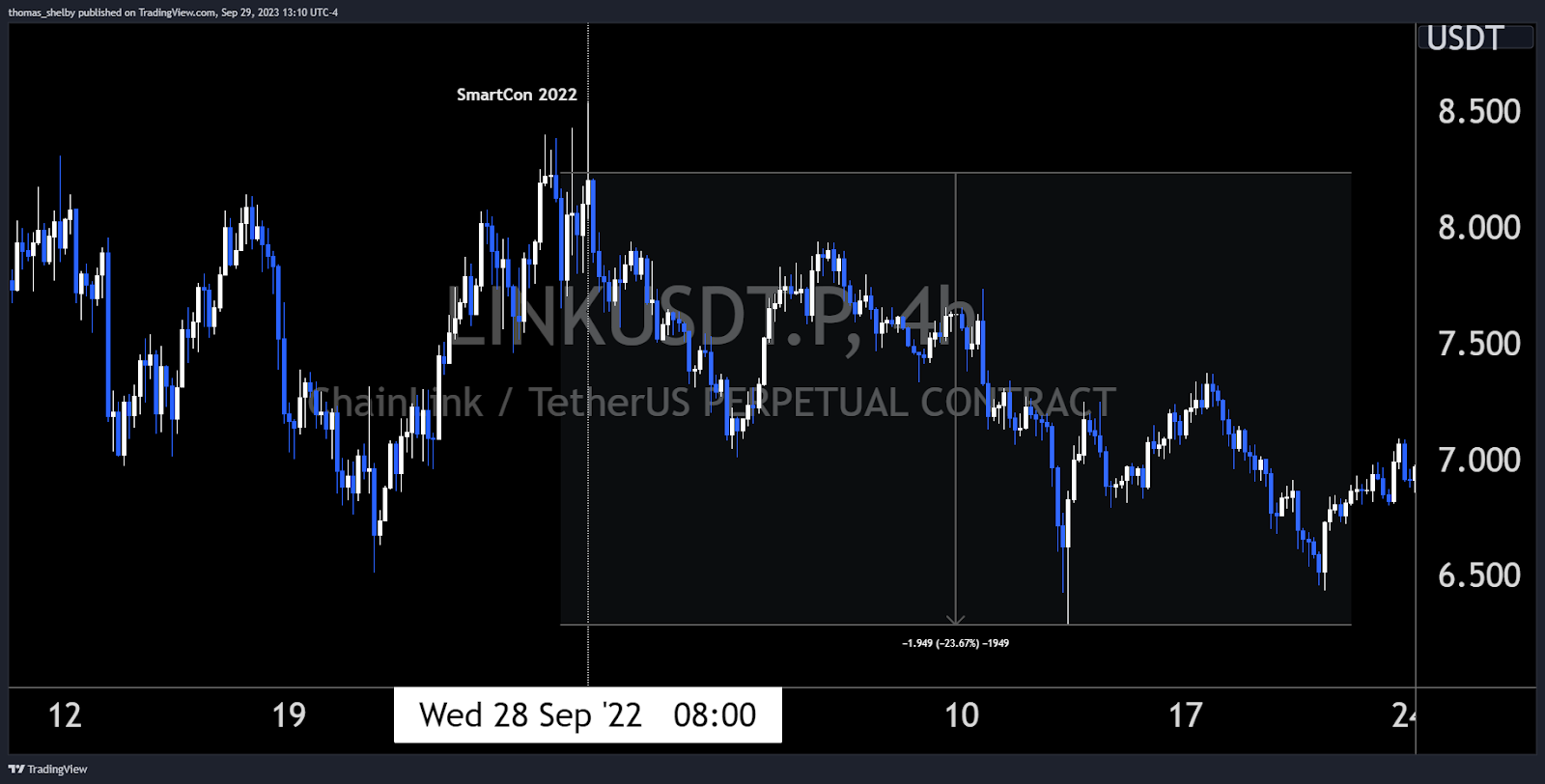 For those that recall, the 2022 SmartCon event saw LINK prices fall over ~20% in the subsequent 15 days. Will this time be different?