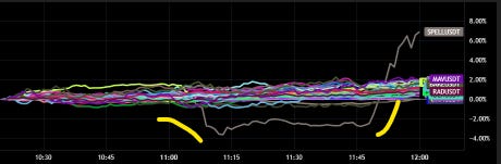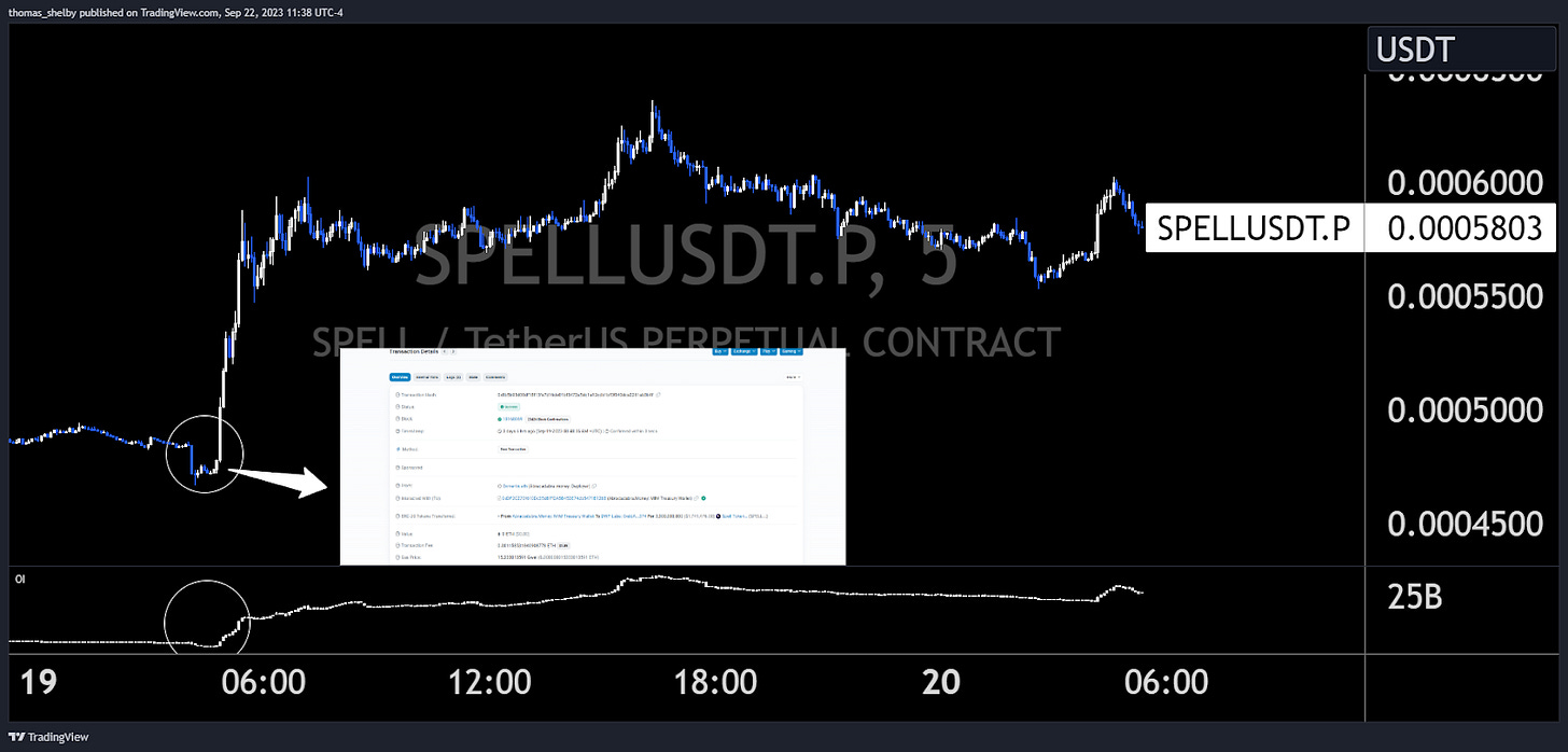 Another point of interest was the sudden increase in sell order deltas right before the news emerged. Spell's value dropped about 3.6%, shaking out some leveraged long positions before the uptick. It's worth mentioning that this small dip was specific to Spell, showing some type of manipulation attempt before the announcement.