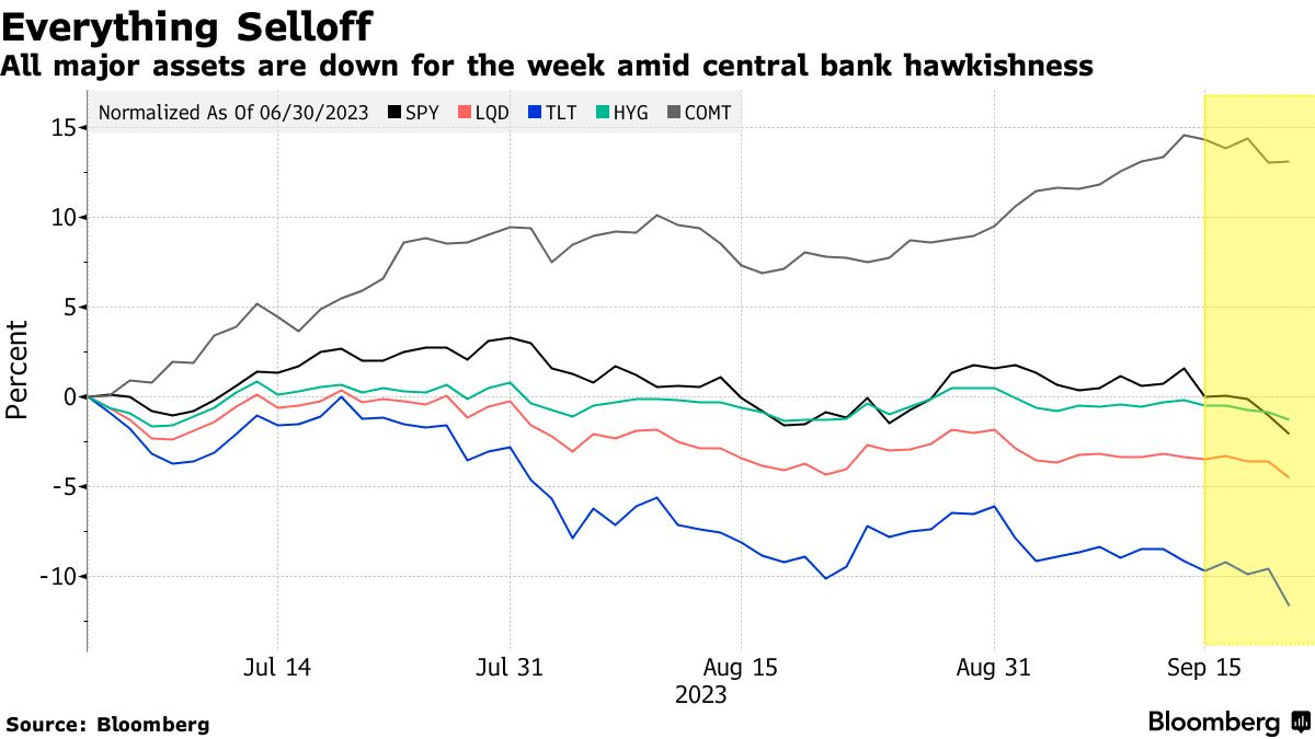 Many investors were caught off guard, expecting the Fed to align with market expectations. The declines accelerated when projections came out and revealed that 12 out of 19 officials penciled out one more rate hike this year and fewer cuts than previously anticipated, resulting in an “everything selloff“ of bonds, stocks and commodities.