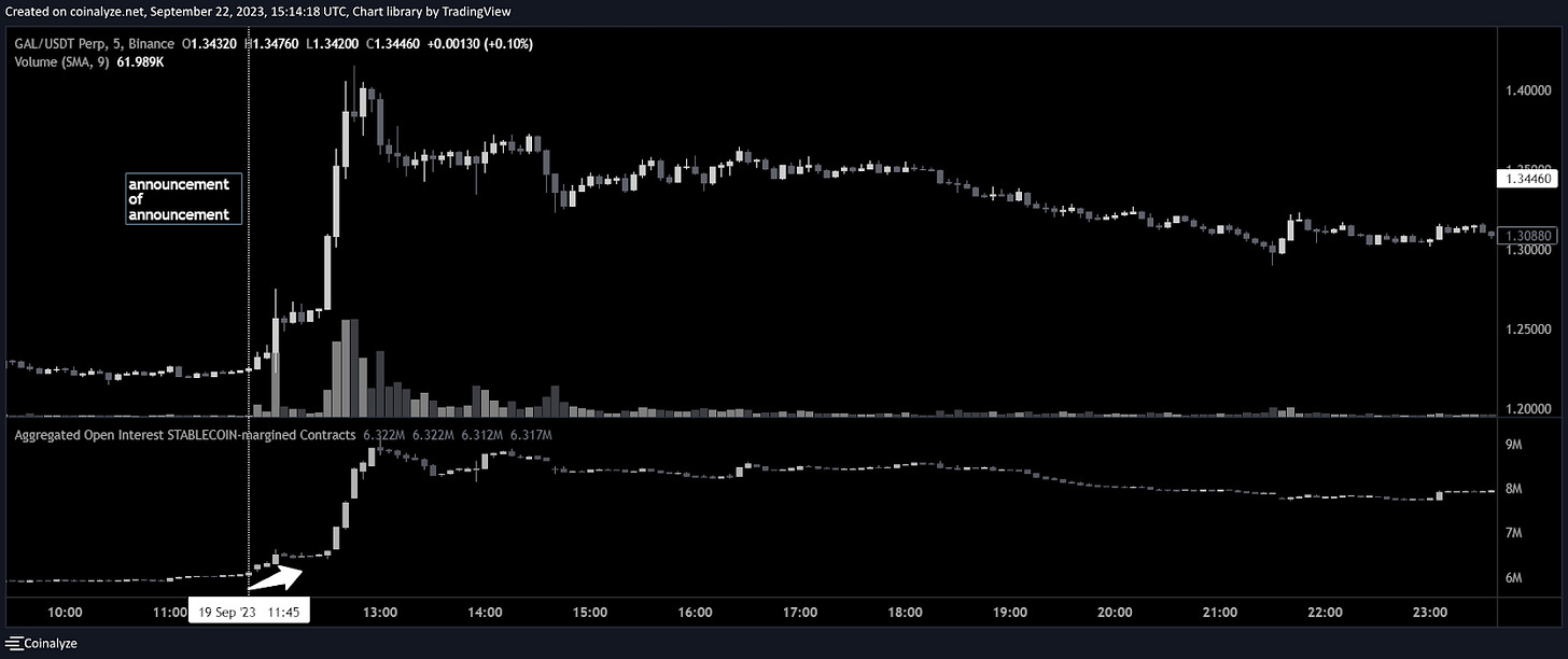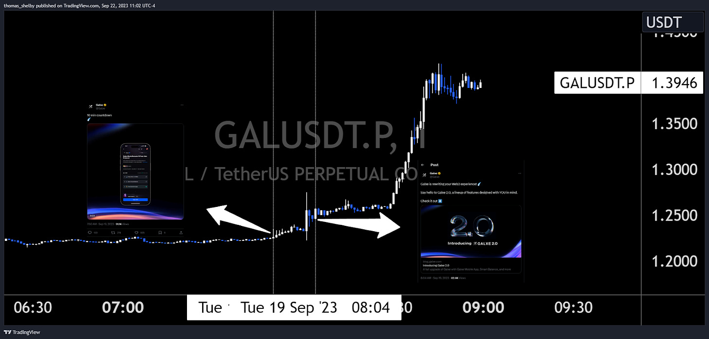 Tuesday, following last week's Bithumb listing, Galxe's Twitter account tweeted an image showing a 10-minute countdown, teasing Galxe 2.0. The new version was unveiled 14 minutes later and includes several new features, including a mobile app, smart balance, and Web3 score. The initial ‘announcement of announcement’ allowed traders to build up long positions, albeit for a short period of time.