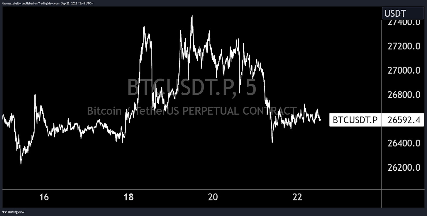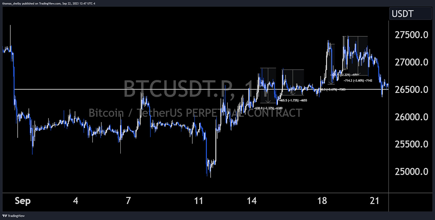 Following last week’s green close, Bitcoin started this week on a bullish note. Monday to Wednesday saw prices rise, expanding the range to 27,500. However, come Thursday, sellers showed up during the Asia session. This was a delayed reaction influenced by the traditional and bond markets' sell off following the prior day FOMC comments/digestion. We are now back to trading at beginning of the week prices.