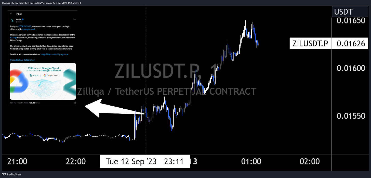 The main announcement saw the price consolidate for some time before surging with a strong bullish momentum. An interesting point to note is that the announcement was partial, as they only released part 1, with part 2 expected to be released later, possibly providing traders with a ‘sell the news' opportunity in the future.