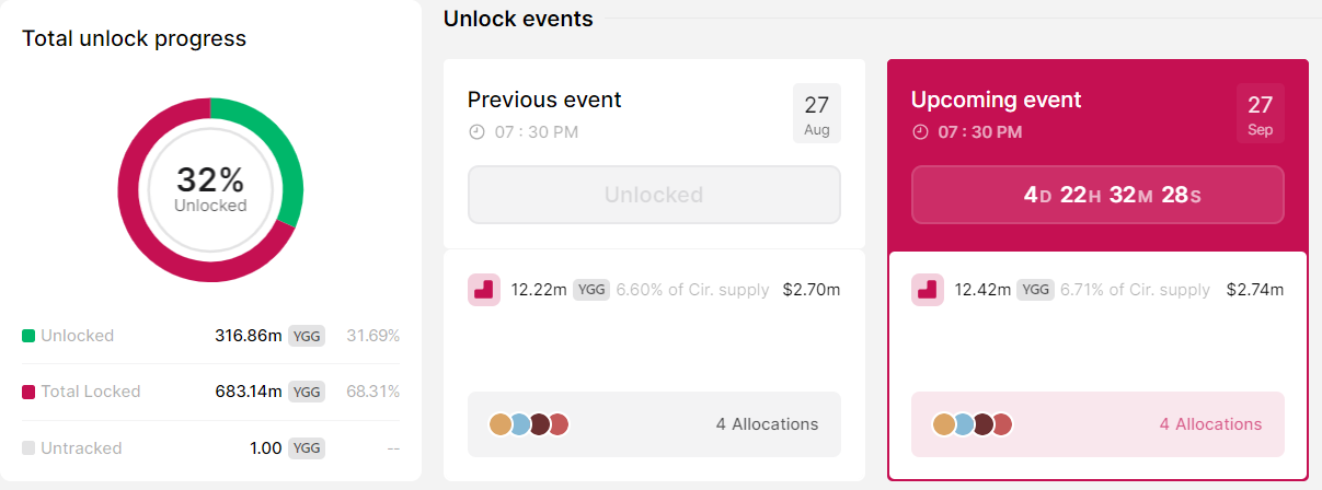 YGG has a 6.71% supply unlock on 27th September. The previous unlock was of similar quantity and had no significant market impact. It is worth noting that the market reaction to unlocks always depends on how traders are positioned going into the event. Large short open interest frontrunning unlocks tend to get squeezed, even though supply increases are considered “bearish” when it comes to tokenomics.