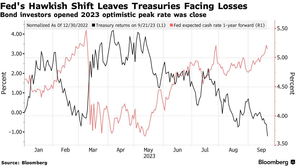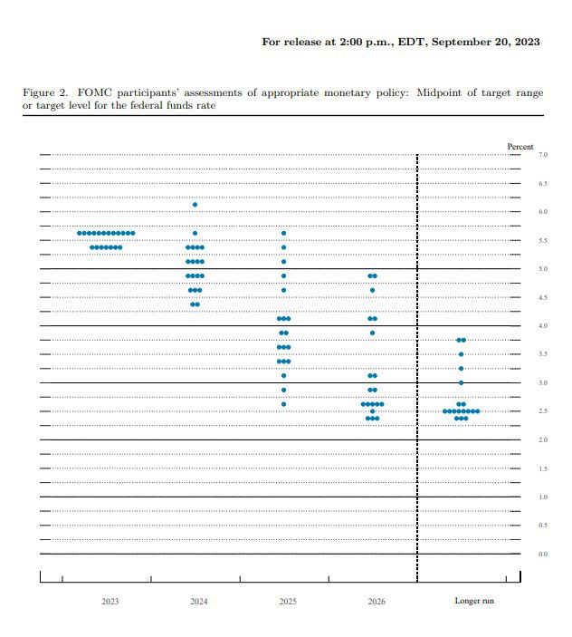 The Federal Reserve maintained interest rates at the September meeting but indicated to keep rates higher for longer. The dot plots revealed a more hawkish stance than expected, with projections showing that policy makers plan to raise their target rate once more by the end of the year, reaching a range of 5.5% - 5.75%. However, they anticipate only two rate cuts in 2024, which is two less than what was forecasted in June. This would put rates around 5.1% by the end of 2024.