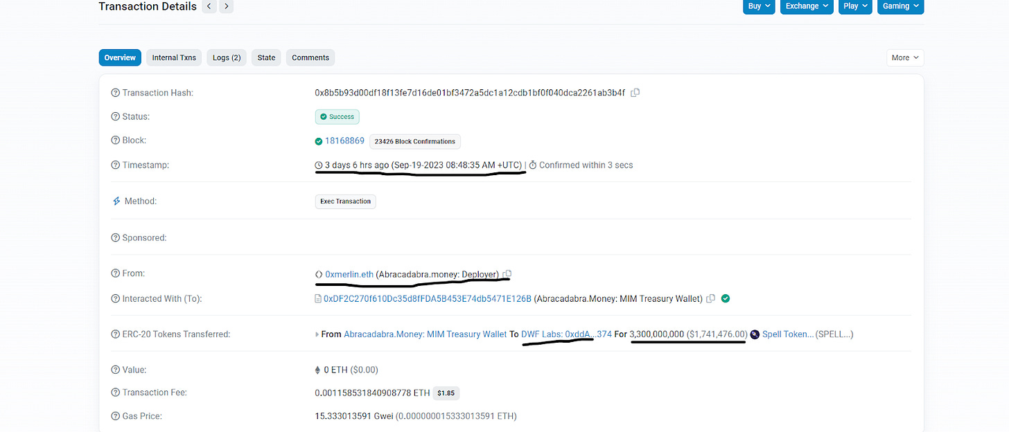 Recently, SPELL has shown a lot of trading activity and momentum following their recent proposal to partner with DWF as their primary market makers. Tuesday morning, a transaction worth $1.75 million, roughly 3.3 billion Spell tokens was noticed through on chain alerts. This transfer was from Abracadabra.Money's MIM Treasury Wallet to DWF Labs.