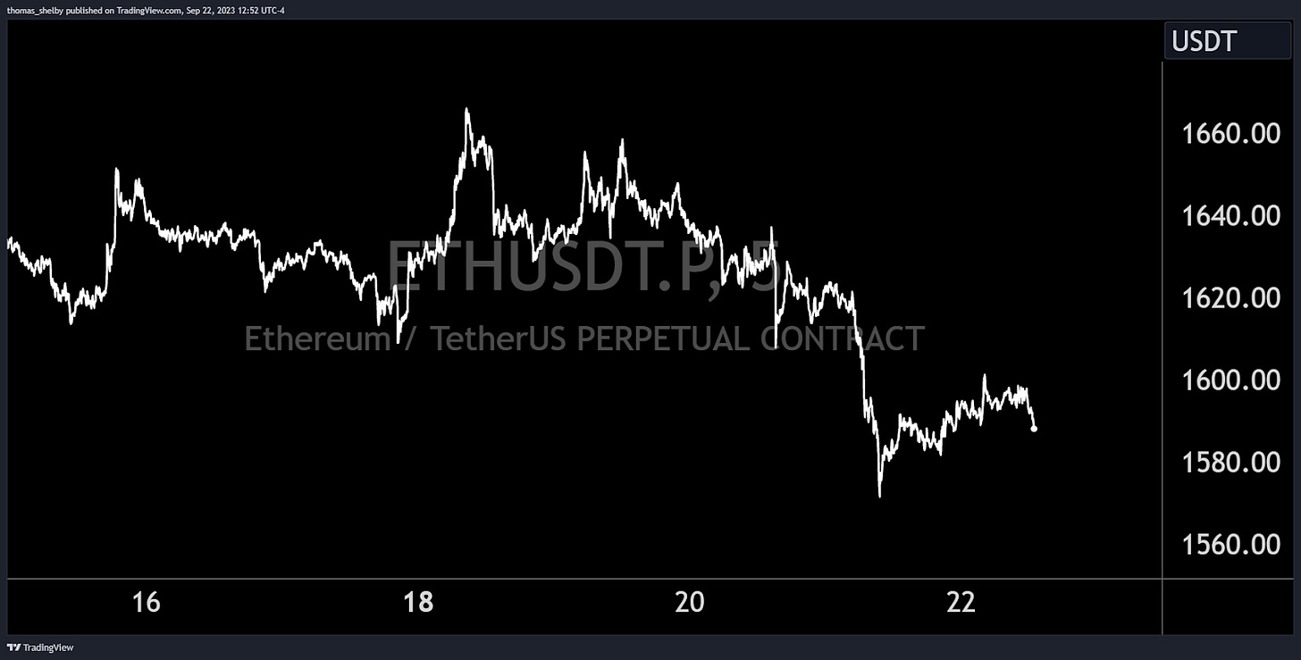 As noted in the previous newsletter, Ethereum continues to lag behind BTC. The ETHBTC pair has decreased by 3% this week. ETH never traded above the Monday highs of 1670s, and is now trading all the way back to 1560s.