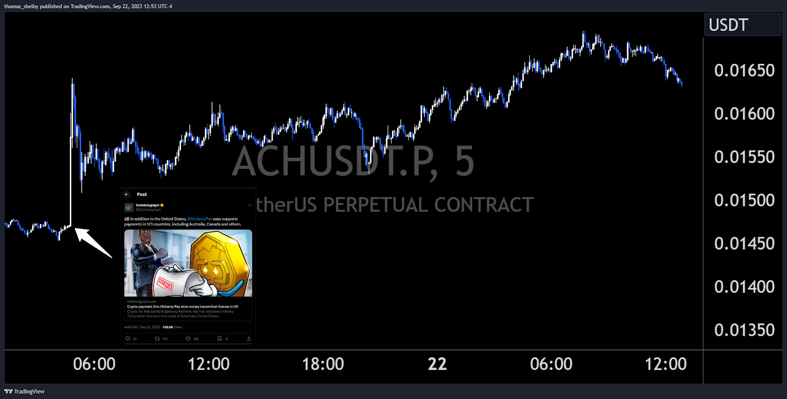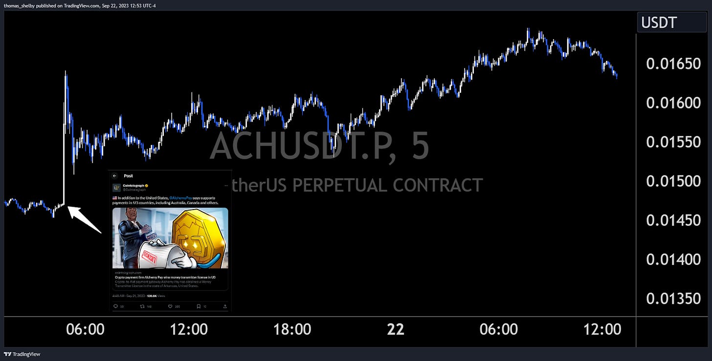 In an announcement by Cointelegraph on Thursday, Alchemy Pay revealed they had obtained a Money Transmitter License in the state of Arkansas. This is a significant development for ACH, as the license also places them in a select group of crypto firms, including giants like Coinbase and Jack Dorsey's Block, who are allowed to legally transmit money in the United States. The price of ACH went up roughly 11.5% following this announcement and continues to maintain its bullish momentum.